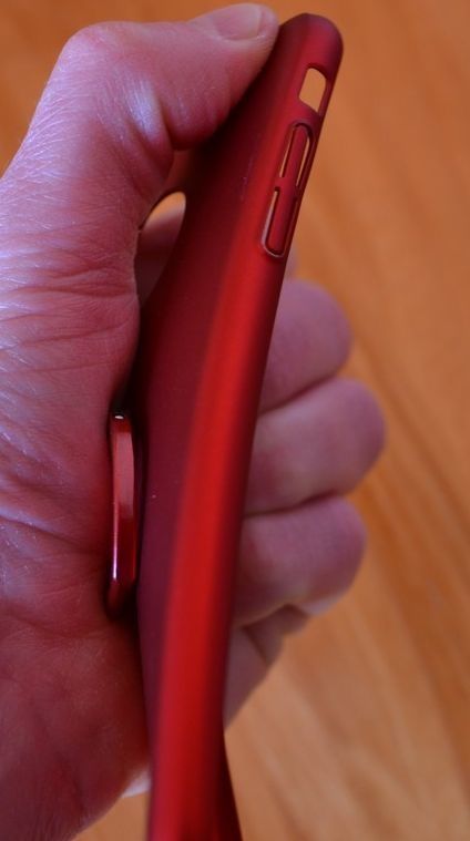 Après la séance de torsion passée avec succès, je pose la coque sur le mobile, un modèle taillé pour l'I-Phone série 6 d'Apple, souple, elle s'adapte avec une surprenante aisance, les angles découpés permettent de rentrer le téléphone sans l'abimer, un réel plaisir !